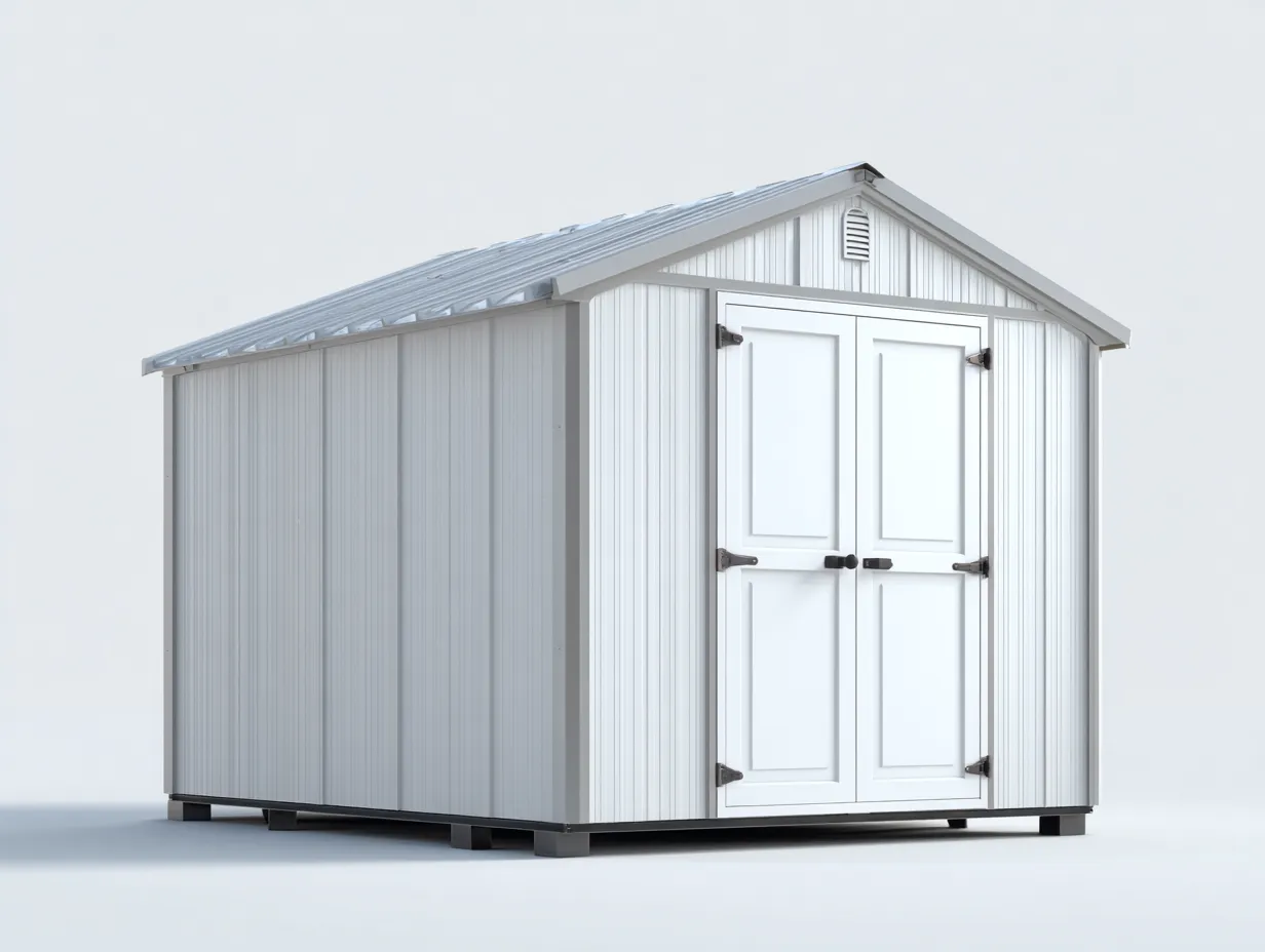 L'abri est fabriqué avec des panneaux résistants de couleur gris et blanc, adaptés à un usage extérieur. La structure assure une bonne stabilité et une protection efficace contre les intempéries.