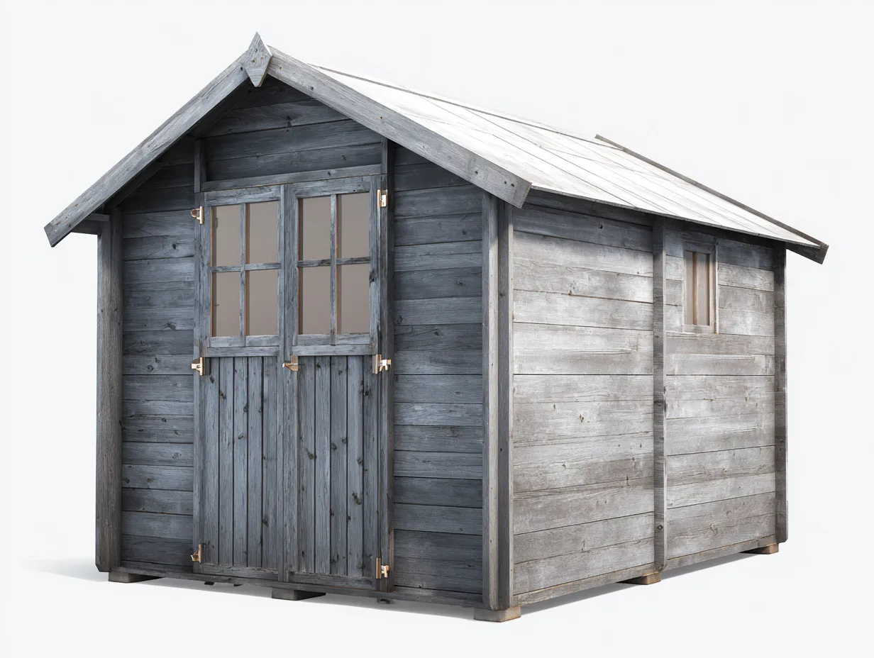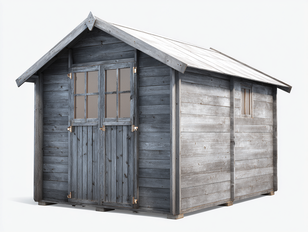 La structure est réalisée en bois avec une finition gris patiné qui met en valeur l'aspect naturel et légèrement vieilli du matériau. Les parois et la toiture présentent une conception robuste, adaptée à une utilisation extérieure régulière.