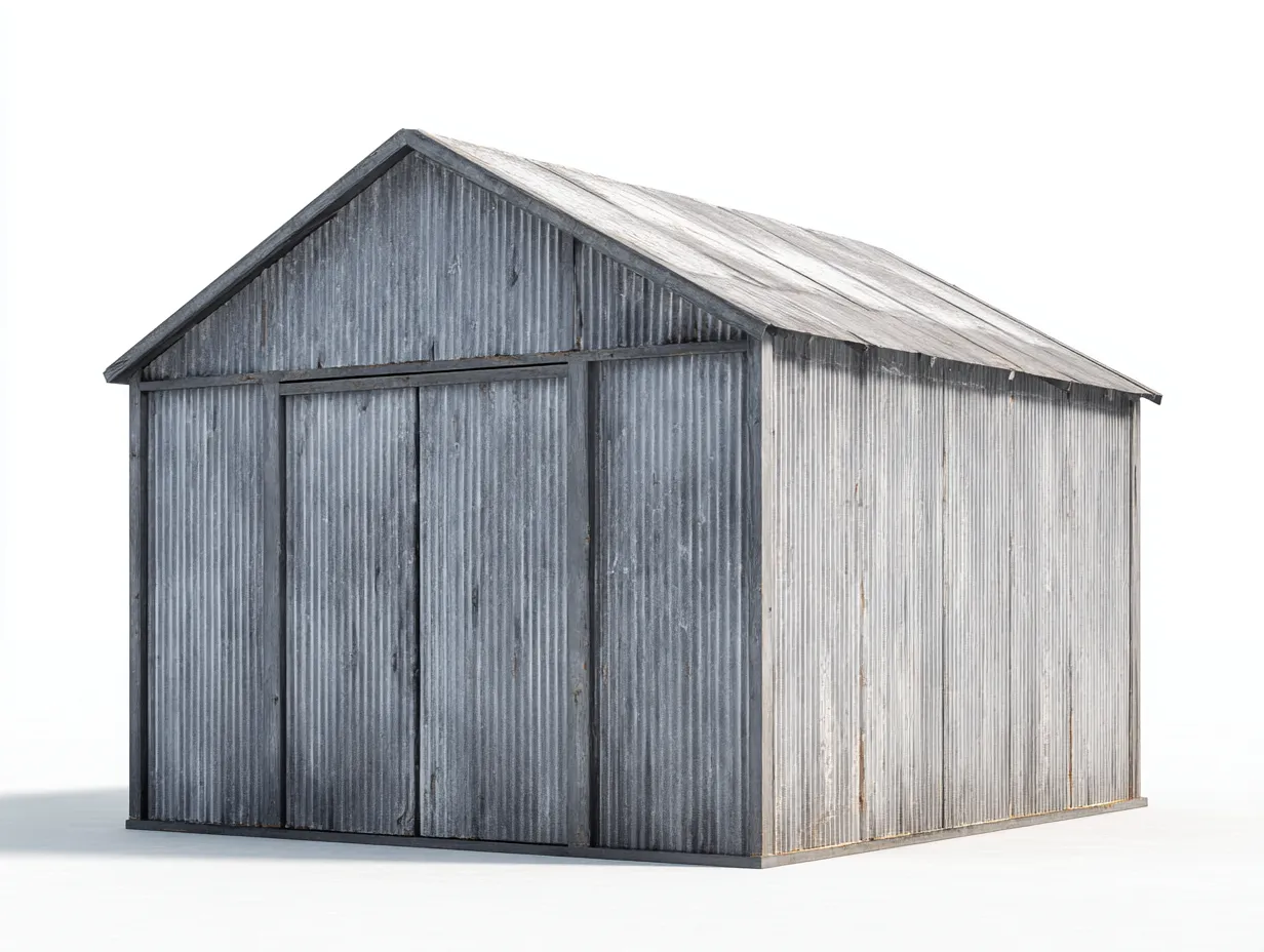 L'abri est fabriqué en panneaux métalliques nervurés avec une finition gris zinc à l'aspect patiné. Cette structure assure une bonne résistance aux intempéries et une utilisation durable en extérieur. Le toit en métal incliné favorise l'écoulement de l'eau de pluie.