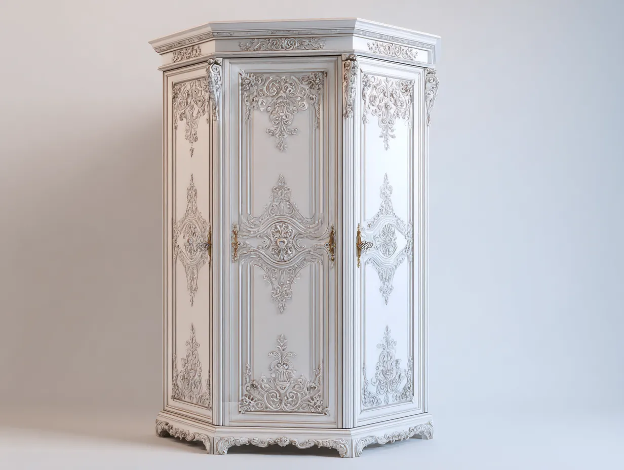 La structure est réalisée en bois avec des panneaux richement sculptés. La finition blanche met en valeur les motifs décoratifs en relief et souligne l'esthétique traditionnelle de l'ensemble. La quincaillerie discrète s'intègre harmonieusement au design.