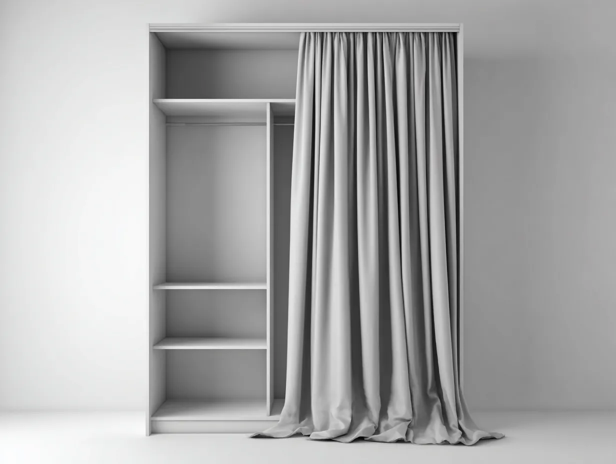 L'armoire est réalisée avec une structure à finition blanche mate, associée à un rideau textile coulissant de couleur grise. L'ensemble présente des lignes simples et une intégration facile dans différents styles d'intérieur.