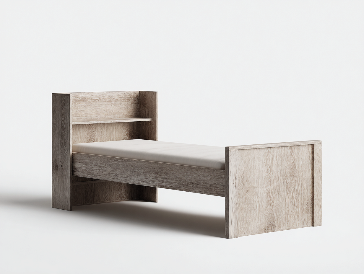 Le lit dispose d'une tête de lit intégrée avec espace de rangement ouvert, permettant de poser des objets du quotidien. Sa conception droite et stable assure un soutien fiable du matelas.