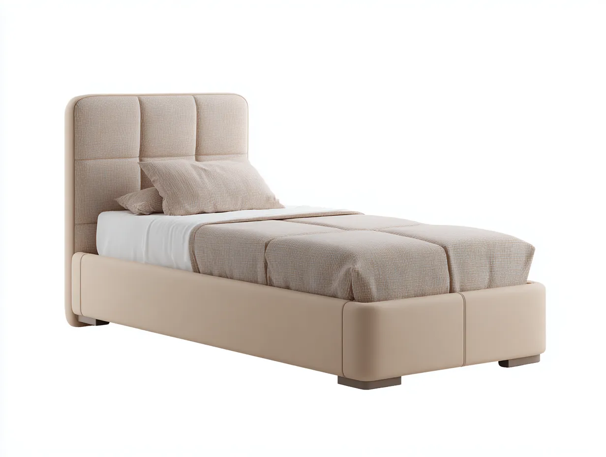 Le lit est revêtu d'un tissu de couleur beige avec une finition rembourrée uniforme. La tête de lit capitonnée apporte une touche esthétique tout en assurant une structure stable et durable.